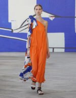 With a full flared skirt. this one piece look has a statement feel. The exposed one-shoulder and hand-pinched flower decoration have an artistic feel. and elegant tone.