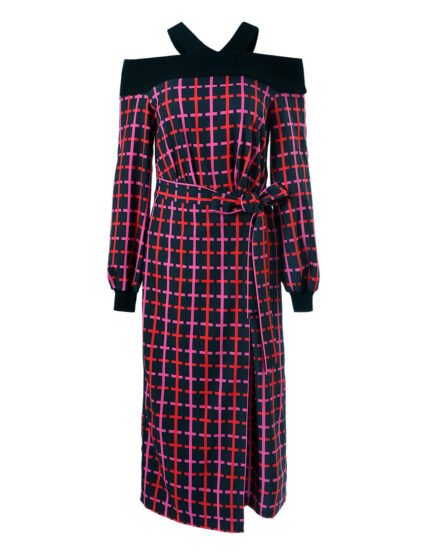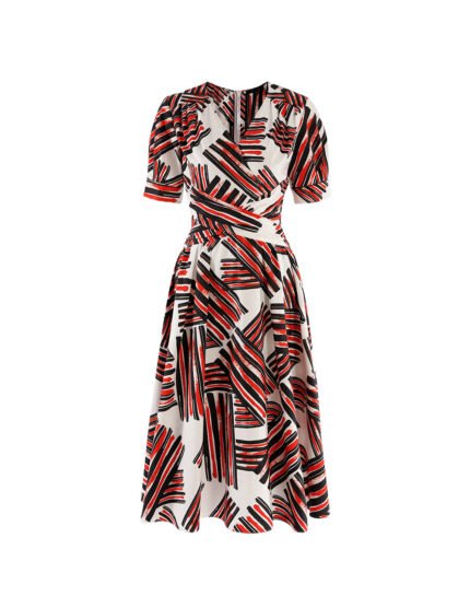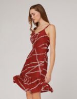 This red and white rope print woven belt dress is made of electro-spun fabric. It features metal eyelets and overlapping waist details to highlight the waistline. It is matched with a ruffled A hem. showing an ethereal atmosphere and a more youthful feel.