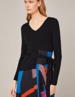 V-neck midi dress crafted from asymmetrical ribbed-knit fabric combined with an abstract flared print georgette dress. It of a kind piece for high-impact and chic dressing.
